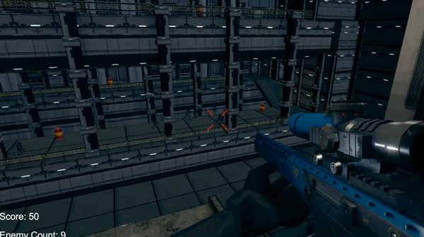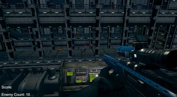 This game is a fps where the player must stop the enemies from reaching the end of the level which is located at the top of a 3 story building. Destroy enemies using the rifle the player is equipped with and/or by shooting exploding barrels near enemies. Each enemy is assigned a random hiding spot where they hide for a random amount of time, before heading for the end which can keep the players on their toes as they have to keep track of where the enemies are. A loss occurs if 50% of the enemies reach the end. A win occurs if the player kills all enemies. Either way there is an option to restart at the end.